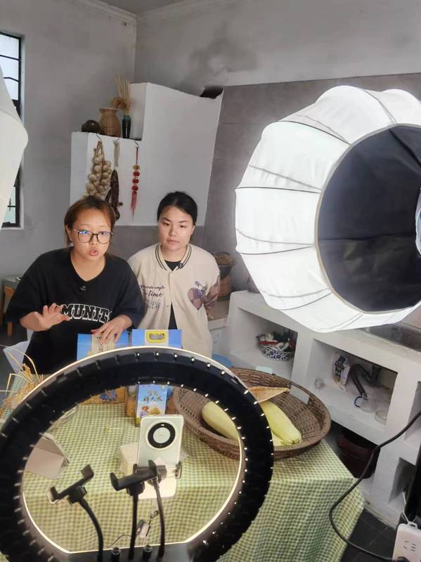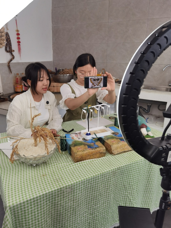 各直播团队搭建自己风格的直播间、调试灯光、设备和音乐、选取合适的户外直播场景等,主播、运营、中控和客服等全方位通力配合,在上农文小创抖音和视频号以及生飞助力平台上开展了“大学生带你体验生飞农场”“好大米是如何生产出来的”“端午节习俗和包粽子体验”“稻米缠花非遗技艺和文创品制作”等直播活动。