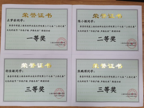 经过朗读评委组认真评审,比赛共评选出一等奖1名、二等奖2名、三等奖3名。生物医药与健康系左梦茹同学《我喜欢出发》获得一等奖;动物科学技术系陈小颖同学《清塘荷韵》、植物科学技术系赵普莹老师《匆匆》获得二等奖;生物医药与健康系胡佳敏同学《白杨礼赞》、植物科学技术系鲍文敏老师《大写的中国》、智慧农业工程系焦鹏博同学《秋天里的中国》获得三等奖。其中,左梦茹、陈小颖、胡佳敏三位同学的诵读作品推选参加2024“博看杯”上海市诵读大赛复赛,近期图书馆微信将发布开启复赛投票的推文,请师生踊跃为三位同学投票。