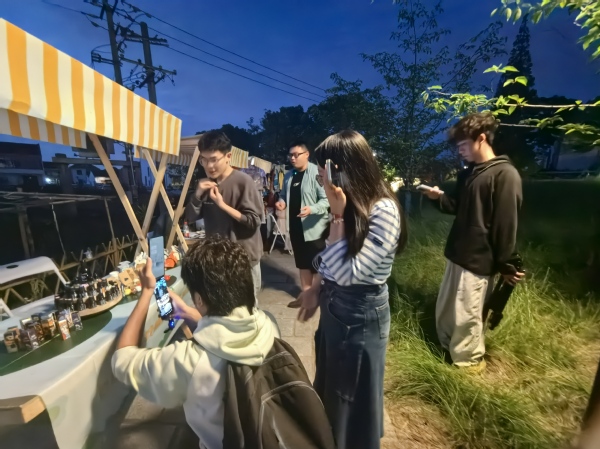 活动现场热闹非凡,来自叶榭的企业商铺、文创工作室以及高校学生团体纷纷设摊展示。游客们不仅可以亲身体验压花、非遗等传统文化,还能观赏并购买到各类精美的文创商品。其中,创意系的学生文创作品展、鲜花地毯更是成为现场的一大亮点,吸引了众多游客驻足观赏。同时,系部新媒体社团也积极发挥自身优势,对现场进行了精彩的直播宣传活动,让更多的人能够感受到叶榭的魅力。