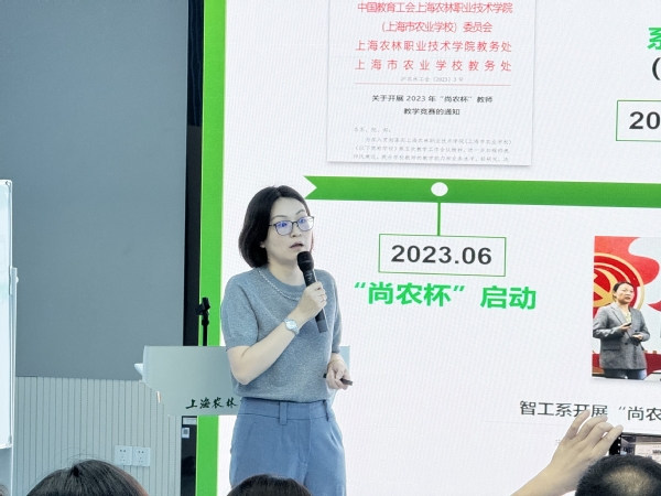 教务处处长王欢介绍了学院第六届青教赛整体备赛情况。学院自2023年6月启动青教赛的校内选拔赛——2023年“尚农杯”教师教学竞赛以来,层层选拔多轮演练,每一次的历练让参赛教师有了可观的成长变化。同时,她为大家展示了学院近三届青教赛获奖教师的获奖经历,成绩的背后是无数次的比赛打磨,每次比赛都是一次蝶变。