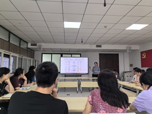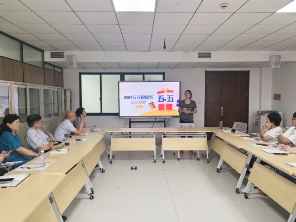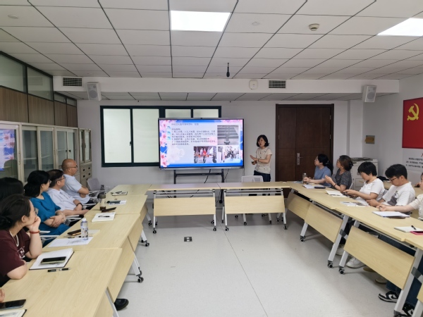党总支副书记张媛结合本学期创意系参与承办的2024年“五五购物节”之青浦区第十二届夏阳枇杷文化旅游节活动进行交流分享,对比了去年和今年活动参与情况,介绍了前期会议筹备、活动策划、展台布置等情况,总结了经验和不足,全体学生会、六个社团、160余名师生参与了志愿服务工作。