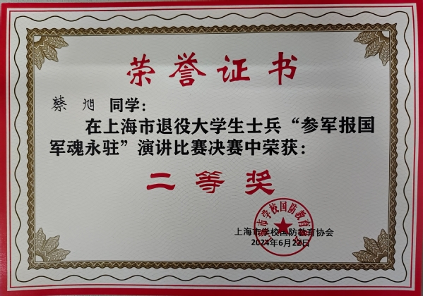 近日,由上海市学校国防教育协会、上海退役军人学院、上海市人民武装学校联合举办2024年上海市退役大学生士兵“参军报国军魂永驻”演讲比赛落下帷幕。我院选手《不负青春 不负戎光》(参赛者:环境222班蔡旭,指导教师:张艳婷)经激烈角逐,以出色表现,在全市本、专科众多参赛者中脱颖而出,获二等奖的好成绩,为校赢得荣誉。