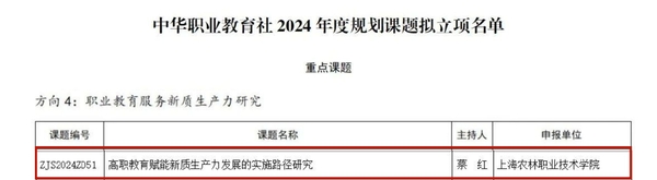 近日,中华职业教育社公示2024年度规划课题拟立项名单。我院蔡红教授申报的课题《高职教育赋能新质生产力发展的实施路径研究》获得职业教育服务新质生产力研究方向重点课题立项,这是我院首次获得该级别课题立项。
