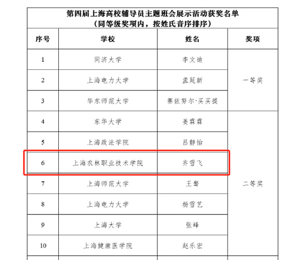 近日,第四届上海高校辅导员主题班会展示活动落下帷幕,全市高校辅导员以赛为台,同台竞技,展示风采,交流经验。生物医药与健康系辅导员齐雪飞以扎实的理论基础和业务功底、从容自信的现场表现,荣获“二等奖”,高东菊获“优秀指导教师”称号,创学院参加该赛事以来的最好成绩。