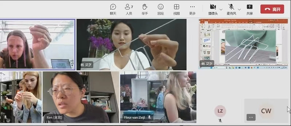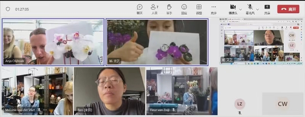 《插花艺术》国际化课程在上海市项一鸣技能大师工作室和上海市首席技师徐卓颖的指导下,由全国技术能手杨灵芝老师精心设计,植科系张微微、成文竞、赵普莹等教师承担沟通协调、课件及视频翻译等工作。课前,课程团队将课程所需花材和辅材清单发至荷兰朗蒂斯教育集团,明确开班时间。首次课上,荷兰MBO Westland 和MBO Oostland等高职院校的师生在荷兰朗蒂斯教育集团培训导师Anja Olijhoek的带领下,一起聆听杨灵芝老师的直播授课;杨灵芝首先对授课主题“花首饰-头花”进行任务导入,要求师生根据婚礼风格以及新娘礼服制作一款头花,在理论讲解和微课解读之后,手把手一同带领荷兰师生共同制作架构式头花,通过铝丝的弯折、叶片卷曲、花朵的串联等技法制作出精巧、灵动的头花,并最终将头花作为首饰戴在头发上。此次课程的开展,不仅为师生们提供了一个了解、学习插花技艺的平台,也让他们在云端交流中感受到了中荷之间的文化差异,荷兰师生充分感受到中国传统花艺文化之美,传播中国插花技艺。