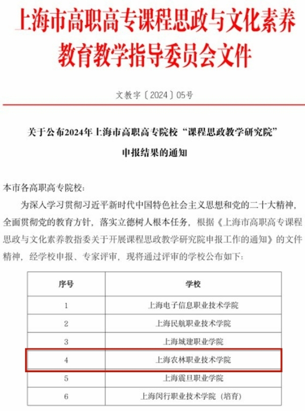 近日,上海市高职高专课程思政与文化素养教指委公布了2024年上海市高职高专院校“课程思政教学研究院”申报结果(文教字〔2024〕05号),学院课程思政教学研究院成功入选。