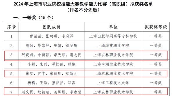7月12日-19日,上海市教育委员会公示了2024年上海市职业院校技能大赛教学能力比赛拟获奖名单,共产生拟获奖团队103个,其中,一等奖19个,二等奖33个,三等奖51个。学院3支教学团队荣获一等奖,1支教学团队荣获三等奖。