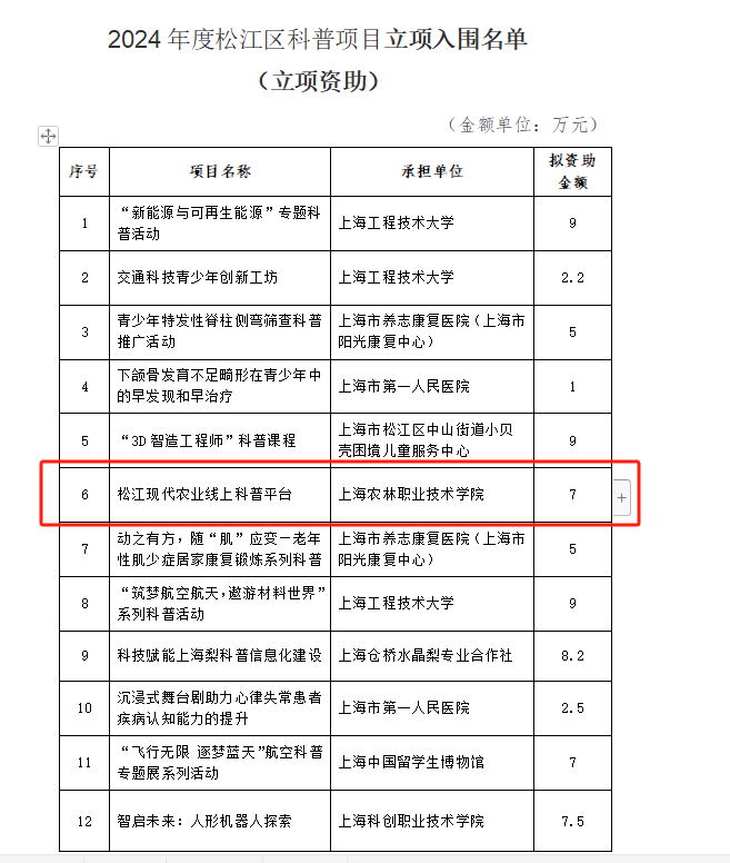 近日,根据上海市松江区科学技术委员会《关于2024年松江区科普项目立项入围名单的公示》文件,我院周燕华老师的《松江现代农业线上科普平台》入围2024年松江区科普项目立项名单,获得资助金额7万元。