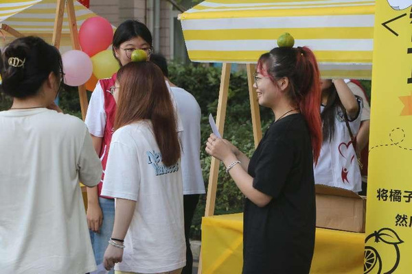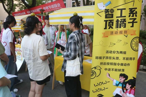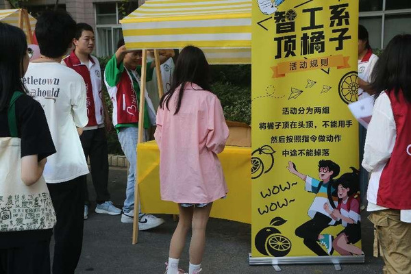 不同于传统的赏月、吃月饼,本次智工系举办了一场别开生面的中秋节游园会活动——“顶橘子”。活动现场热闹非凡,欢声笑语交流声不断,前来参赛的学生们首先于入场签到领取中秋活动手册,后被分为两两一组。参赛学生们怀着紧张又兴奋的心情将青黄色的橘子稳稳置于头顶,全程不能用手触碰,同时又按照裁判随机给出的指令做动作,中途不能掉落。参赛学生们小心翼翼地调整着自己的步伐和姿态,努力让头顶的橘子成为中秋之夜的“不倒翁”。这不仅考验了参赛学生们的平衡能力,更是一种对心理能力和应变能力的锻炼。