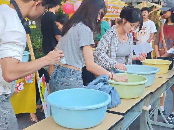 “捞月”活动以独特的方式吸引了众多同学参与。参与者需要用筷子将乒乓球从一个盆中夹到另一个盆中,这不仅考验了大家的手眼协调能力,也带来了无限的乐趣。活动现场充满了欢声笑语,大家在欢乐的氛围中感受到了中秋节的独特魅力。