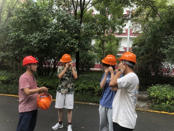进入施工现场前,后勤处为师生分发安全防护用品,并指导师生正确佩戴安全帽,详细介绍了入场前的注意事项。