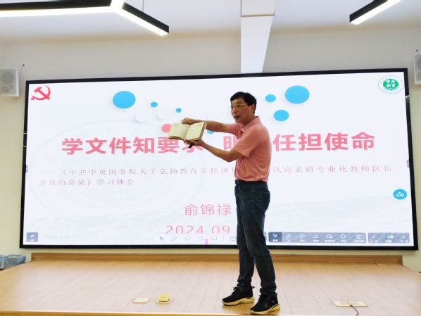 为进一步弘扬教育家精神,深入学习贯彻《中共中央 国务院关于弘扬教育家精神加强新时代高素质专业化教师队伍建设的意见》文件精神,9月20日下午,在农经楼308室,创意系党总支邀请学院退休老党员、原纪委书记俞锦禄老师为全体党员开展“学文件知要求 明责任担使命”主题党课。