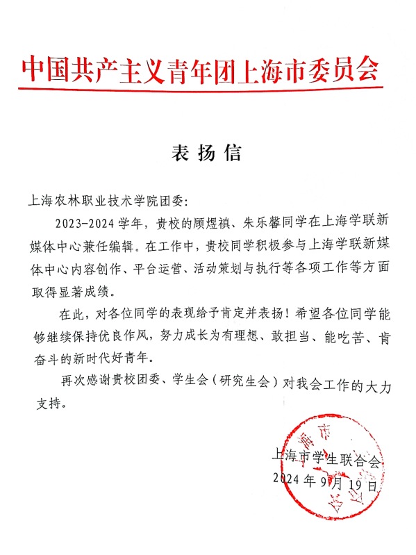 近日,学院团委收到上海市学生联合会表扬信,对学院在上海学联新媒体中心兼任编辑的质检(中高贯通191)班顾煜禛、环境222班朱乐馨同学在上海学联新媒中心的工作表现予以表扬。