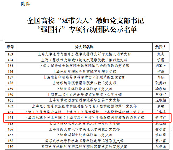 近日,教育部思想政治工作司发布《关于全国高校“双带头人”教师党支部书记“强国行”专项行动团队名单的公示》,生物医药与健康系教师党支部成功入选。