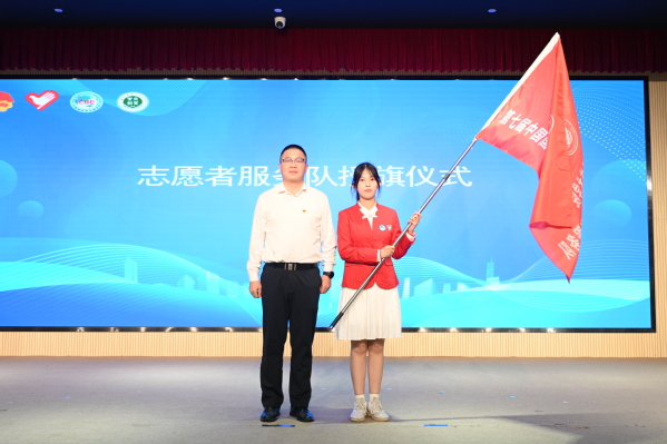 邵阳为志愿者代表授旗,对所有志愿者们送上寄语,并提出三点要求和期望:一是提高政治站位,强化责任担当,彰显新时代青年态度;二是立足岗位要求,锤炼过硬本领,展现上农青年精神风貌;三是夯实育人载体,提升服务能级,持续打造“小叶子”成长成才的青春舞台。