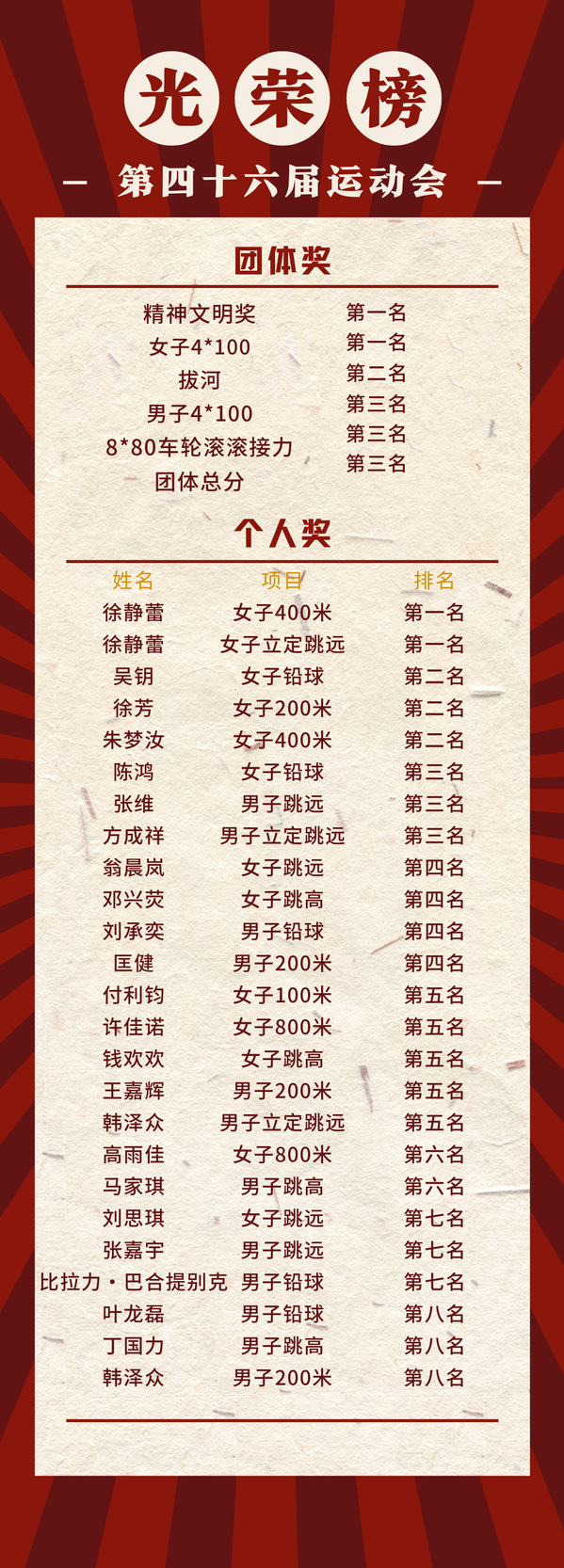 本次运动会为期一天半,设立了100米、200米、4×100米接力、800米、跳高、跳远、铅球、拔河等丰富多样的项目。创意系运动员们在比赛过程中顽强拼搏,全力以赴。经过激烈的竞赛,我系运动员徐静蕾夺得女子400米和立定跳远第一名,朱梦汝夺得女子400米第二名吴玥夺得女子铅球第二名;丁新田夺得男子100米第一名,张维夺得男子跳远第三名,方成祥夺得男子立定跳远第三名;女子4x100米接力夺得第一名,男子4x100米接力夺得第三名,拔河比赛夺得第二名;师生合作完成的80×8车轮滚滚接力项目荣获第三名。