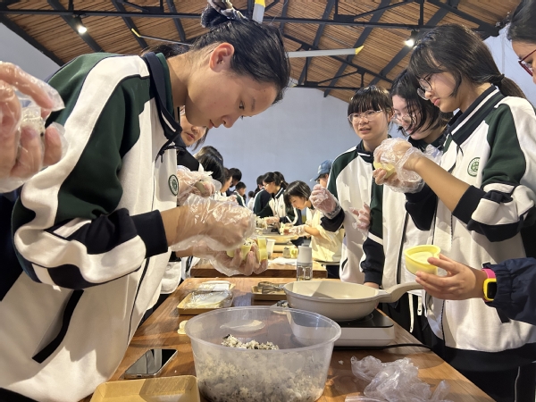 参观草莓园、番茄园和香蕉园,制作饭团、火龙果汁,喂养动物……一系列丰富的课外劳动实践内容,让学生们沉浸式体验了田间地头的“农耕生活”。将农识、农事、农趣融合在了一起,同学们既学习了稻米的文化知识,草莓、番茄、香蕉的养殖过程,也动手制作了农产品的衍生品,如鲜榨火龙果汁、香煎饭团等,不仅“大开眼界”还“干劲十足”。