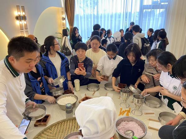 叶榭软糕,作为一种珍贵的非物质文化遗产,承载着深厚的历史与文化底蕴。老师详细讲述了这一传统美食的历史渊源,从选材的讲究到制作工艺的精湛,每一个细节都透露出匠人的智慧与对美味的极致追求。同学们在老师的带领下依次进行了筛粉、刮平、用特制的木蛋轻轻压出精致的坑洞、细心填入香甜的豆沙馅、最后再小心翼翼地脱模等一系列工序,随着一块块精致可口的叶榭软糕诞生,他们的脸上洋溢着成就感与喜悦。