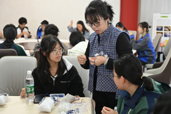 通过简短的介绍,同学们了解了筘布的历史、特点和制作工艺。在老师的引导下,穿针引线、缝上流苏、塞进艾草……一块块朴素的筘布经过巧手缝制,成为了一枚枚精巧的香囊。同学们热情高涨,精心制作,感受着传统工艺细节的精湛、劳动的艰辛。经过一番努力,一个个精美的香囊逐渐成形,同学们拿着自己亲手做好的香囊,展示自己的劳动成果。