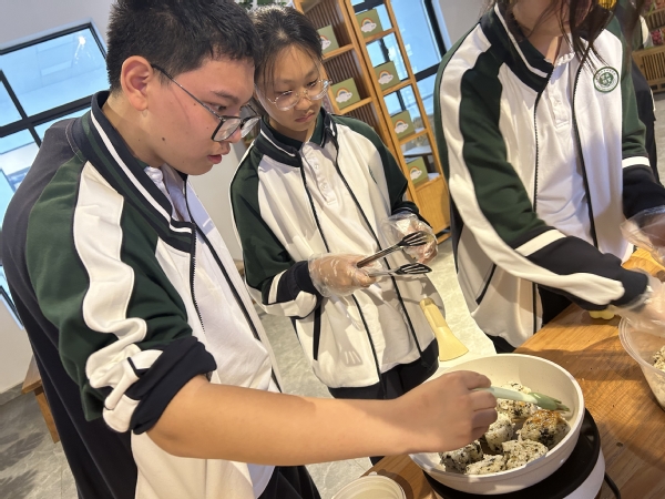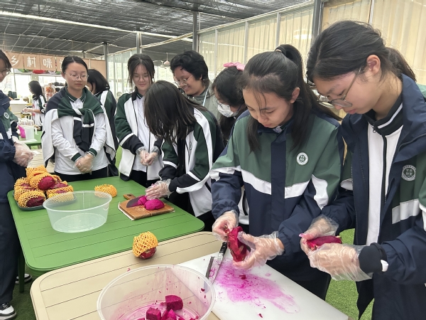 参观草莓园、番茄园和香蕉园,制作饭团、火龙果汁,喂养动物……一系列丰富的课外劳动实践内容,让学生们沉浸式体验了田间地头的“农耕生活”。将农识、农事、农趣融合在了一起,同学们既学习了稻米的文化知识,草莓、番茄、香蕉的养殖过程,也动手制作了农产品的衍生品,如鲜榨火龙果汁、香煎饭团等,不仅“大开眼界”还“干劲十足”。