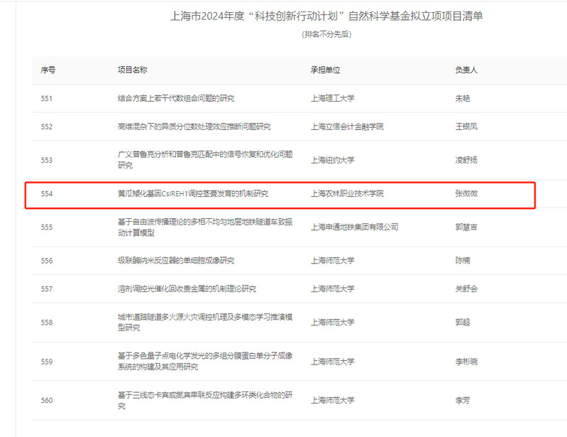 近日,上海市 2024 年度“科技创新行动计划”自然科学基金拟立项项目名单公布,我院张微微教授团队的“黄瓜矮化基因 CsIREH1 调控茎蔓发育的机制研究”项目再次成功入选。