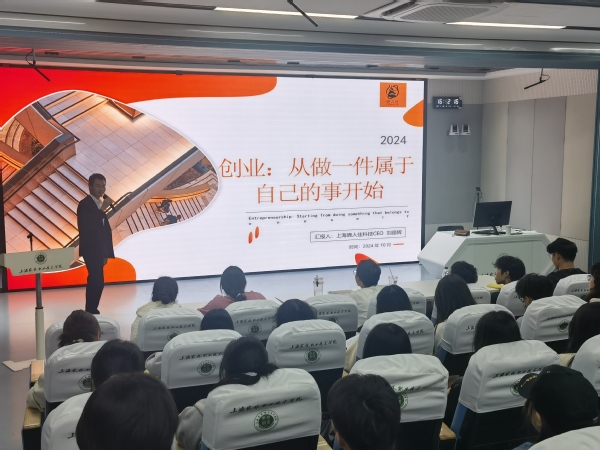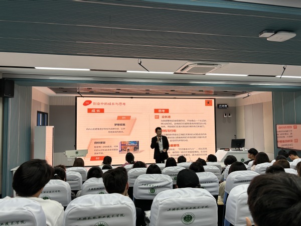 10月29日下午,在综合楼303室,生物医药与健康系和“预·见”辅导员工作室开展“筑梦青春 榜样领航”大学生就业创业分享会。我院环境工程技术专业2022届毕业生、上海鹿人佳科技有限公司CEO、中国国际大学生创新大赛2024年职教赛道上海赛区金奖项目负责人刘德辉来校作主题分享。生物医药与健康系党总支副书记胡慧春、“预·见”辅导员工作室负责人范小雪、学生代表等60余人参加。