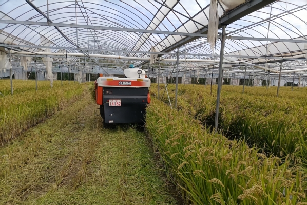 11月5日,浦东实训基地首次尝试在大棚内种植的水稻开镰收割。尽管大棚内种植水稻面临诸多生产及机械操作上的困难,但在基地工作人员的共同努力下,不仅成功完成了种植任务,还取得了令人满意的成果。