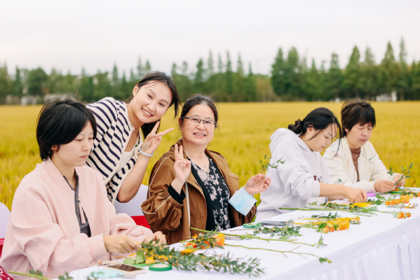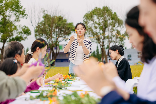 此外,全国技术能手、上海市人大代表、我院青年教师杨灵芝村民带来了插花体验课程。本次授课在稻谷围绕的中心课堂举行,围绕“丰收的喜悦”这一主题,杨灵芝现场讲授插花知识,传授插花艺术的文化内涵和审美价值,手把手耐心指导村民制作艺术胸花。村民们亲手制作,亲身体验传统文化的魅力和乐趣,进一步增强了文化自信和民族自豪感。