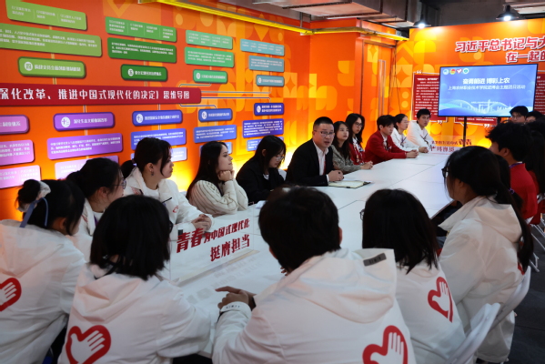 为更好地组织和引领大学生志愿者参与志愿服务活动,加强志愿者队伍的凝聚力和战斗力,组织成立了2个临时团支部,以团支部为基本单元在服务期间开展政治理论学习。服务期间,党委副书记、副院长邵阳和团委书记张楠来到国家会展中心中国馆及“志愿者之家”学习园地,与“小叶子”代表一同参加“奋勇前进 博彩上农”沉浸式主题团日活动。并寄语同学们要在志愿服务中厚植爱国情怀、增长个人见识、增强综合素质,深刻认识到进博会对上海及中国的重要意义,用青春实践,在进博服务中赓续“上农青年志愿故事”。马克思主义学院王欢欢老师也和“小叶子”代表一起走进中国馆,开展了一堂生动的沉浸式思政课。