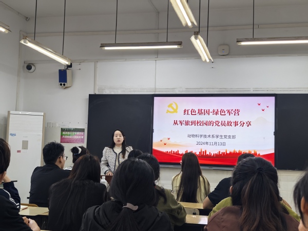 本次活动将红色基因与绿色军营的元素紧密融合,邀请了本系一位有着独特经历的退伍学生党员祖力开尔,为动科系的青年学子们讲述其在部队的亲身经历以及入党的心路历程。