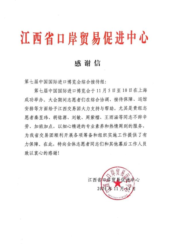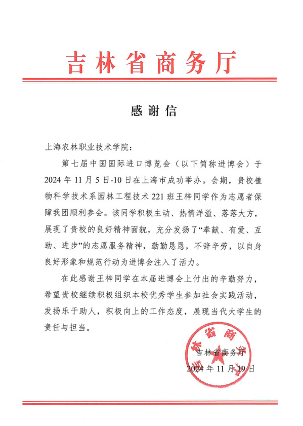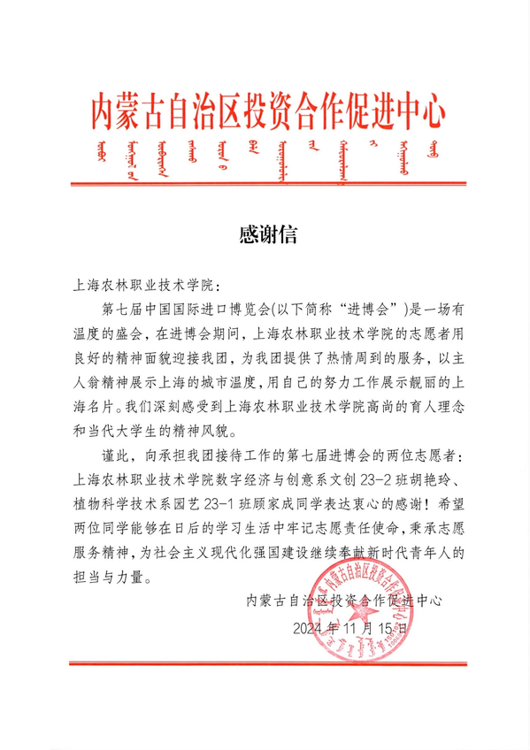 近日,学院收到来自江西省口岸贸易促进中心、内蒙古自治区投资合作促进中心和吉林省商务厅的感谢信。信中充分赞了上农青年在进博会接待任务中的工作表现,肯定了学院的育人理念和志愿者精神风貌。并寄望同学们能够在日后的学习和生活中牢记志愿责任使命,秉承志愿服务精神,为社会主义现代化强国建设继续奉献新时代青年人的担当与力量。
