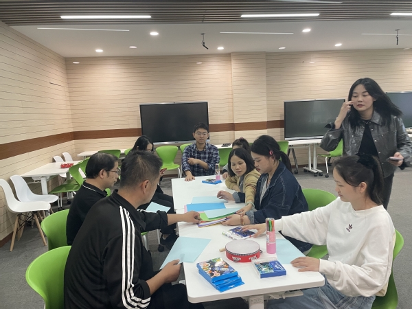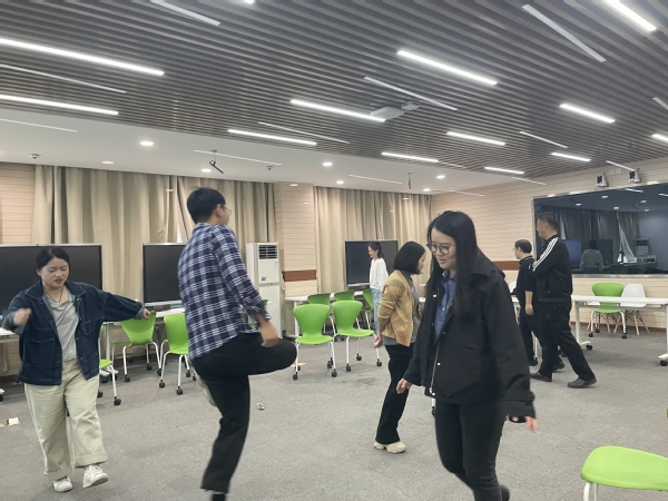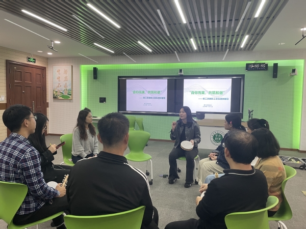 活动现场,专家介绍了音乐疗法的原理、应用及其对心理健康的积极影响。并通过播放不同类型的音乐,引导教师们感受音乐带来的情绪变化。教师们也分组尝试了多种简易乐器,如手铃、沙锤、口琴等,感受不同乐器的音色与表现力。同时,嘉宾还指导教师们利用拍打身体的不同部位创造声音,形成别具一格的节奏与旋律。这一环节不仅让教师们充分感受到了音乐的无限可能,更在轻松愉快的氛围中促进了教师间的交流与互动,增进了彼此间的友谊与默契。在即兴表演环节,教师们分组合作,利用简易乐器、肢体语言等即兴发挥,将内心的情感与团队的默契融入音乐之中,共同创作了一段充满创意的音乐作品,不仅展现了教师们的艺术才华,更彰显了智工系团队的凝聚力与创造力。