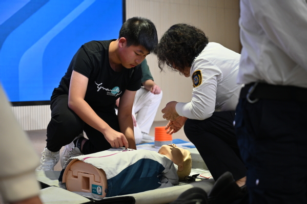 度老师介绍了急救知识技能在日常生活中的重要性,强调了学习急救技能对于保障生命安全、构建和谐社会的重要意义。在老师的指导下,同学们利用人体模型,对心肺复苏AED应急救护设备操作、海姆立克操作等步骤进行分解练习,从识别紧急情况到实施有效救助,每一步都严格按照标准流程进行。老师们对每个人的动作进行认真细致地指导,确保大家能掌握专业、精准的急救方法。