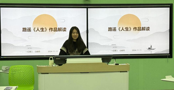 在读书分享环节,白晴雨同学先播放了一段视频,让大家了解《人生》的故事情节。《人生》这部作品以改革时期陕北高原的城乡生活为时空背景,描写了高中生高加林回到土地又离开土地,再回到土地的人生变化过程,高加林同农村姑娘刘巧珍、城市姑娘黄亚萍之间的感情纠葛构成了故事发展的主要矛盾。白晴雨同学以主人公高加林的感情线为主进行分享,还讲述了作者路遥艰苦的成长岁月和青年时期读书与创作的经历,帮助大家走进作者,了解作者。