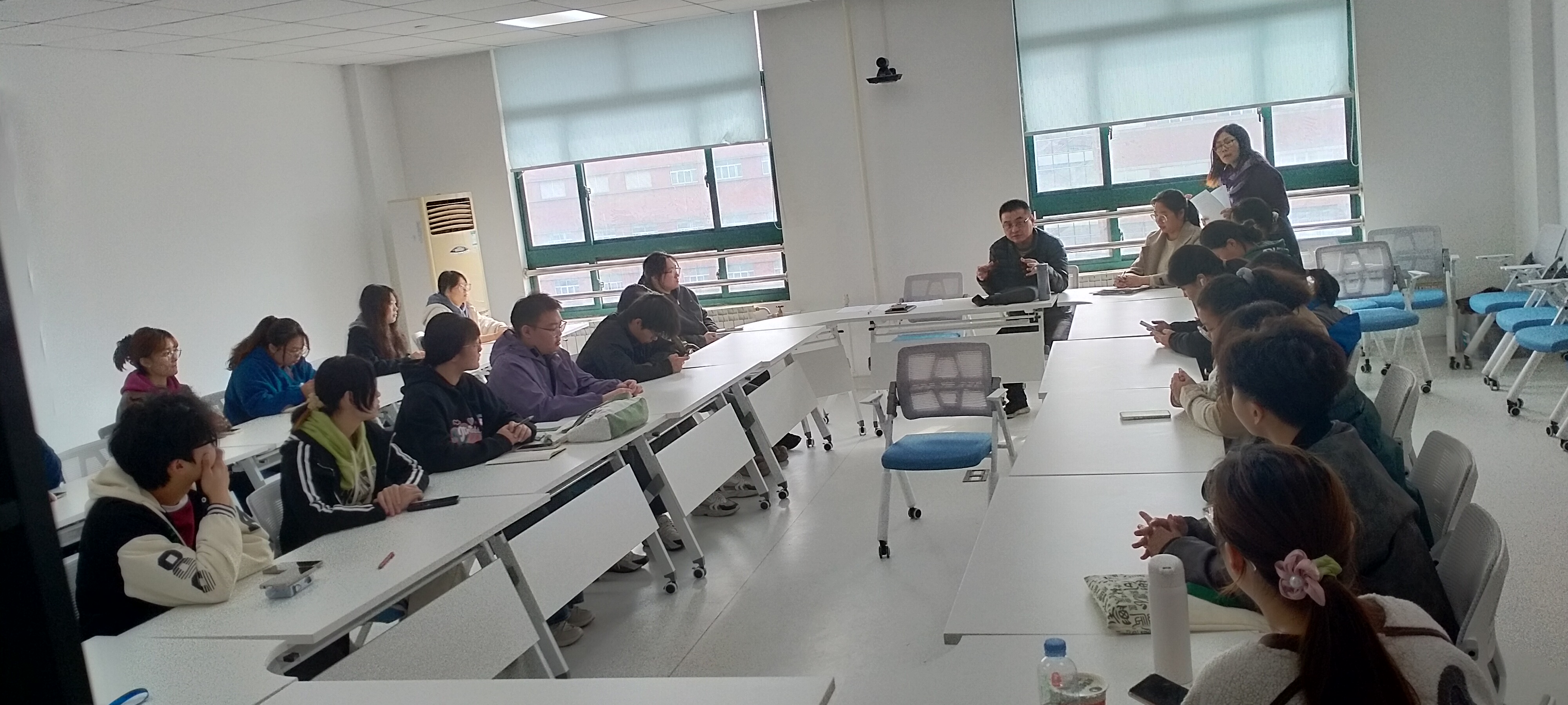11月25日,在综合楼809会议室,马院召开2024-2025学年第一学期学生期中座谈会,毛概教研室主任尹来也主持本次座谈会,任课教师刘悦、20位来自不同年级与专业的学生参与本次座谈会。