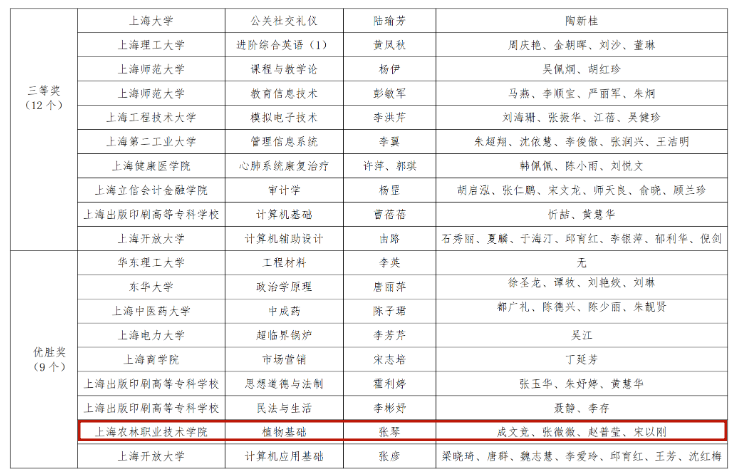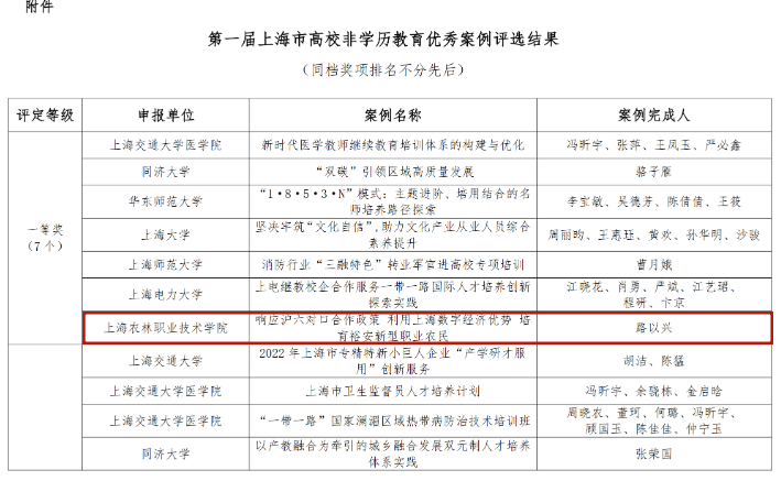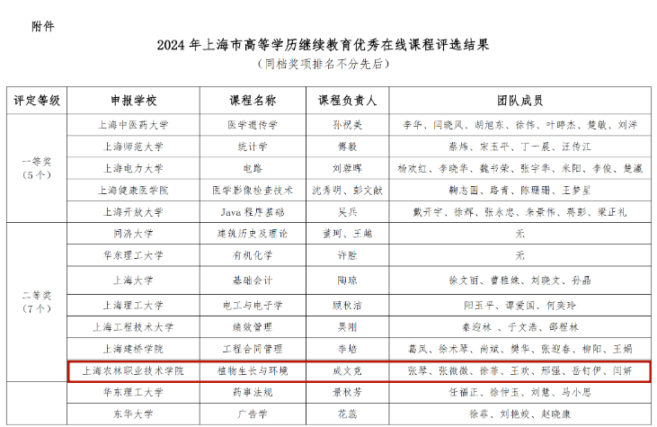 数字经济与创意系路以兴报送的《响应沪六对口合作政策 利用上海数字经济优势 培育裕安新型职业农民》获得非学历教育优秀案例一等奖。植物科学技术系成文竞等报送的《植物生长与环境》课程获得高等学历继续教育“优秀在线课程”二等奖,张琴等报送的《植物基础》课程获得高等学历继续教育“优秀在线课程”优胜奖。