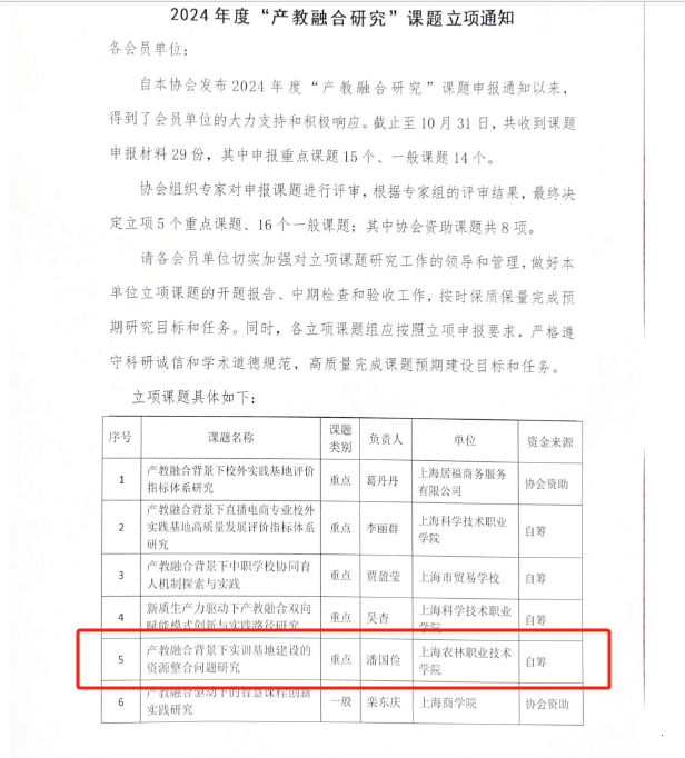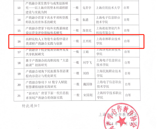 近日,上海产学合作教育协会公布2024 年度“产教融合研究”课题立项通知。我院潘国俭副院长申报的课题《产教融合背景下实训基地建设的资源整合问题研究》获得重点课题立项;智工系王兴旺老师申报的课题《高职院校人工智能专业程序设计类课程产教融合实践与创新》获得一般课题立项。