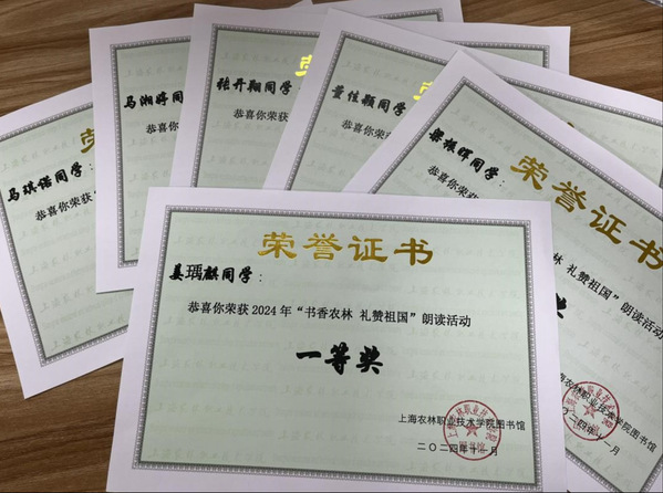 植物科学技术系姜瑀麒同学的诵读作品《锦绣》荣获一等奖,生物医药与健康系梁振晖同学的诵读作品《陈情表》、植物科学技术系董佳颖同学的诵读作品《伟大建党精神》荣获二等奖,生物医药与健康系张开翔同学的诵读作品《领跑者—致敬“复兴号”列车》、植物科学技术系马湘婷同学的诵读作品《祖国的位置—致敬“北斗三号”》、植物科学技术系马琪诺同学的诵读作品《飘扬的国旗啊》荣获三等奖。