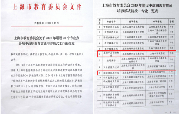 近日,上海市教育委员会公布了《关于2025年增设28个专业点开展中高职教育贯通培养模式工作的批复》(沪教委职〔2024〕45号),学院与上海食品科技学校联合申报的物联网应用技术专业、上海市环境学校联合申报的生物产品检验检疫专业获批中高职教育贯通培养模式专业。