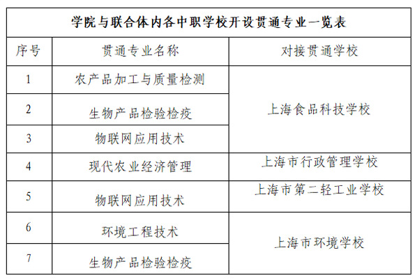 根据《上海市教育委员会关于继续开展中高职教育贯通培养模式试点工作的通知》(沪教委职〔2011〕34号)、《上海市教育委员会关于继续开展中高职教育贯通培养模式试点工作的补充通知》(沪教委职〔2012〕25号)和《上海市教育委员会关于进一步加强职业院校中高职贯通教育的通知》(沪教委职〔2022〕31号),学院与上海食品科技学校、上海市环境学校在深入开展物联网应用技术、生物产品检验检疫专业人才需求市场调研的基础上,进一步明确专业人才培养目标,面向职业核心能力,构建一体化人才培养方案,落实规范的五年贯通培养流程,充分发挥两校在专业累积、管理经验、师资力量、实训条件和校企合作资源等多方面的优势,积极申报物联网应用技术、生物产品检验检疫专业。