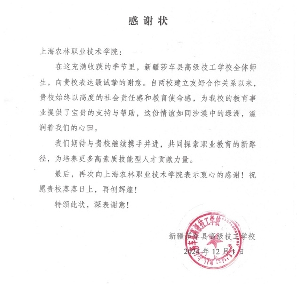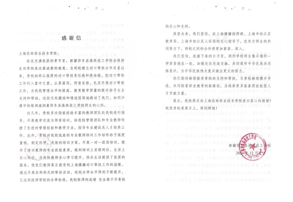 信中提到,自两校建立对口帮扶合作关系以来,学院始终以高度的责任感和使命感,把对口帮扶工作列为重中之重,扎实开展对口帮扶工作,为莎车县高级技工学校管理水平的提高、教育教学质量的提升给与了大力支持和帮助,这份无私援助和情谊如同沙漠中的绿洲滋润着莎车学校师生的心田。