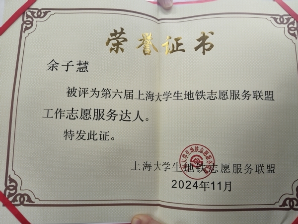 除了日常的志愿服务工作,该服务队还积极拓展服务范围和服务时间,新增了4个服务站点,总计服务时长达到了20637.8小时,在松江区名列前茅。团队因此荣获“2023年度上海地铁志愿服务先进团队”称号。余子慧同学作为动科系的一员,在志愿服务组织工作中表现出色,自2023年9月起精心策划并统筹安排了超过百次的服务活动,无论是在日常地铁站服务还是在进博会等重要时期的保障服务中,都展现了高度的责任感和专业精神。她的努力得到了认可,被评为“上海市志愿服务优秀组织者”,同时在2024年11月与宠物231班的贺梦婷一同获得志愿服务达人称号。