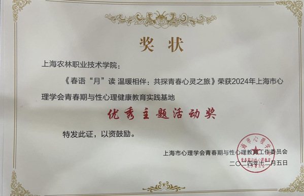 近日,上海市心理学会青春期与性心理教育工作委员会第四届学术年会在上海市商业学校举行,《春语“月”读 温暖相伴:共探青春心灵之旅》以心理育人的实效性与活动育人的有效性,被评选为青春期与性心理教育实践基地优秀主题活动,动科系心理辅导员刘春参加本次会议领奖。