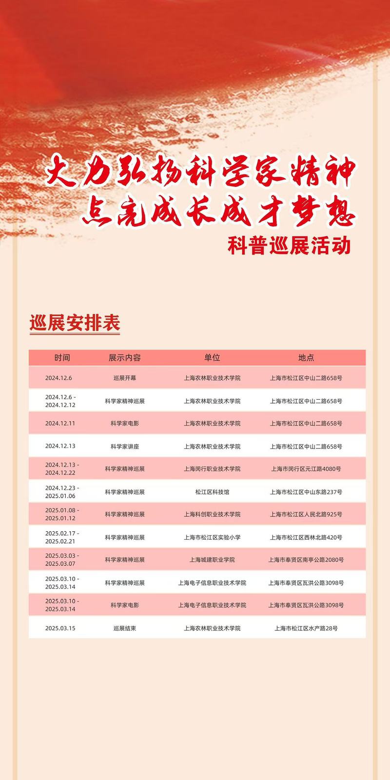 本次科学家精神展计划以学院为起点,在7家单位进行巡展,全方位地展示我国杰出科学家如严东生、钱学森、叶叔华、吴孟超、袁隆平、屠呦呦等在科研成就,求学之路以及爱党爱国三个方面所取得的突出成果。让广大师生在领略科学家们的卓越成就和高尚精神的同时,汲取奋进的力量,树立远大的理想和抱负,为实现中华民族伟大复兴的中国梦而努力拼搏。