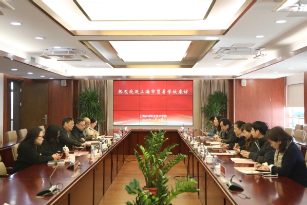 12月16日,上海市贸易学校党委书记邵金敏一行7人来校交流。党委书记蔡红出席,副院长张江主持座谈会。