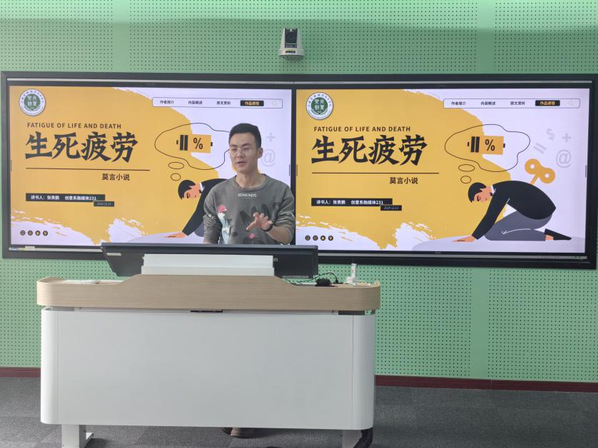 在读书分享环节,张贵鹏先播放了《生死疲劳》的视频,讲述了一个被冤杀的地主经历了六道轮回变成驴、牛、猪、狗、猴,最后终于又转生为一个带着先天性不可治愈疾病的大头婴儿的故事。书中,大头婴儿滔滔不绝地讲述着他身为畜牲时的种种奇特感受,以及地主西门闹一家和农民蓝解放一家半个多世纪生死疲劳的悲欢故事。小说透过各种动物的眼睛,观照并体味了五十多年来中国乡村社会的庞杂喧哗、充满苦难的蜕变历史。