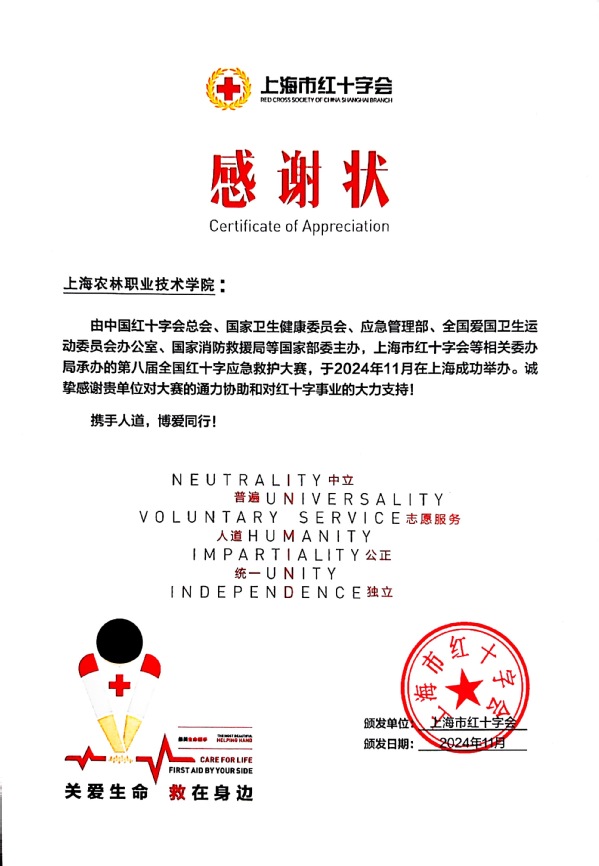 近日,学院收到来自上海市红十字会的感谢状,向学院在第八届全国红十字应急救护大赛中的协助和对红十字工作的支持表达感谢。