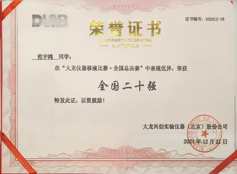系部高度重视此次比赛,在备赛期间,指导老师朱骏驰精心制定了系统全面且极具针对性的训练计划。范宇鸿同学作为本次年龄最小的参赛选手,最终面对在实验领域深耕多年、成果丰硕的硕士与博士的竞争和复杂的实验表现依然出色,用实力证明了自己,也彰显了系部在专业技能教学方面的卓越成效。