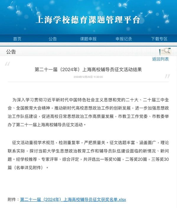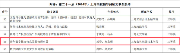 近日,上海市教卫工作党委、市教委发布了第二十一届(2024年)上海高校辅导员论文征文获奖名单。刘春、高东菊撰写的论文《青年数字社交特点及其伦理审思》斩获三等奖,实现学院在上海高校辅导员论坛征文活动中零的突破。