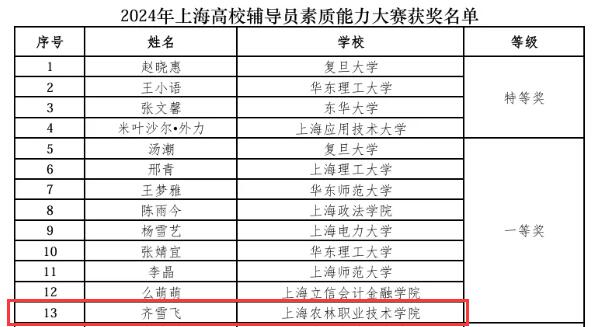 近日,由市教卫工作党委、市教委组织开展的2024年上海高校辅导员素质能力大赛在东华大学圆满落幕,经过激烈角逐,生物医药与健康系辅导员齐雪飞脱颖而出,斩获一等奖(高职唯一),学工部高东菊获评“优秀指导教师”,标志学院在该项大赛中取得历史性突破。